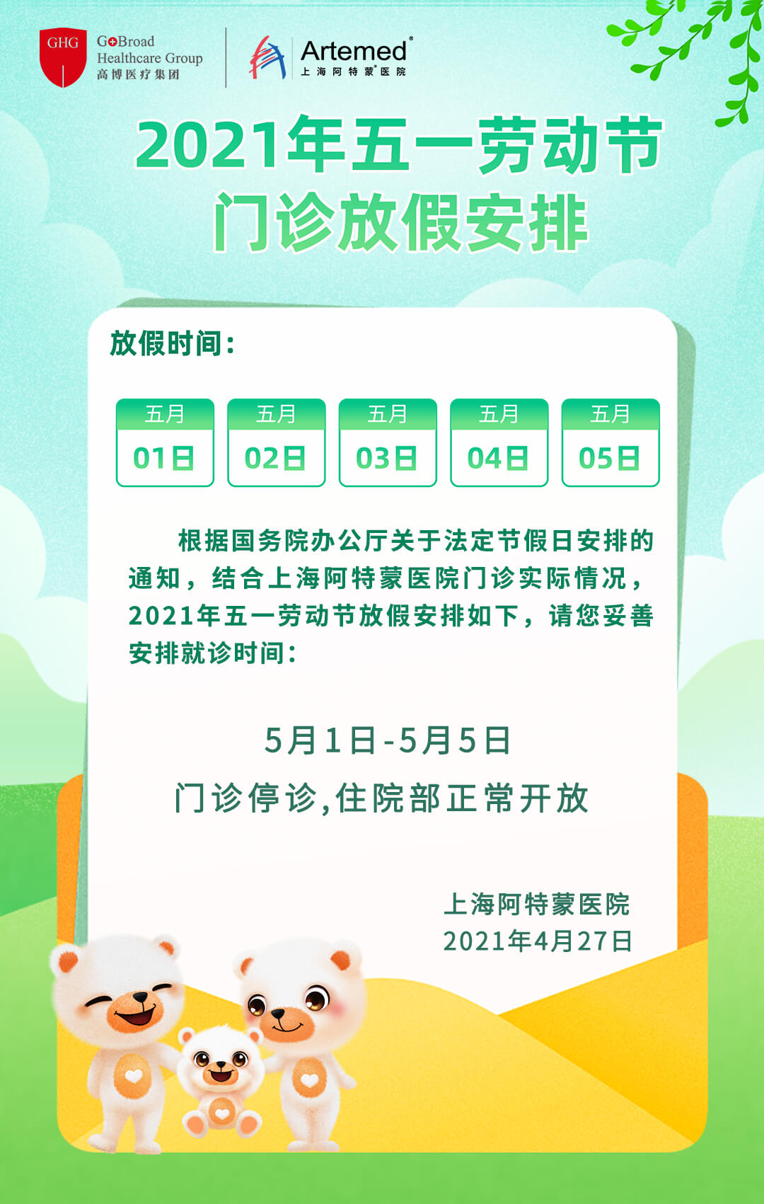 根據國務院辦公廳關于法定節假日安排的通知,結合上海阿特蒙醫院門診實際情況,2021年五一勞動節放假安排如下,請您妥善安排就診時間:5月1日—5月5日門診停診,住院部正常開放。