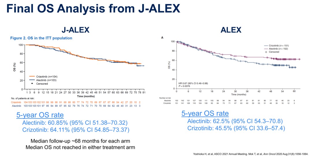 5.Yoshioka H, Hida T, Nokihara H, et al. Final OS analysis from the phase Ⅲ j-alex study of alectinib (ALC) versus crizotinib (CRZ) in Japanese ALK-inhibitor na?ve ALK-positive non-small cell lung cancer (ALK+ NSCLC)[J]. ASCO 2021, abstract 9022.